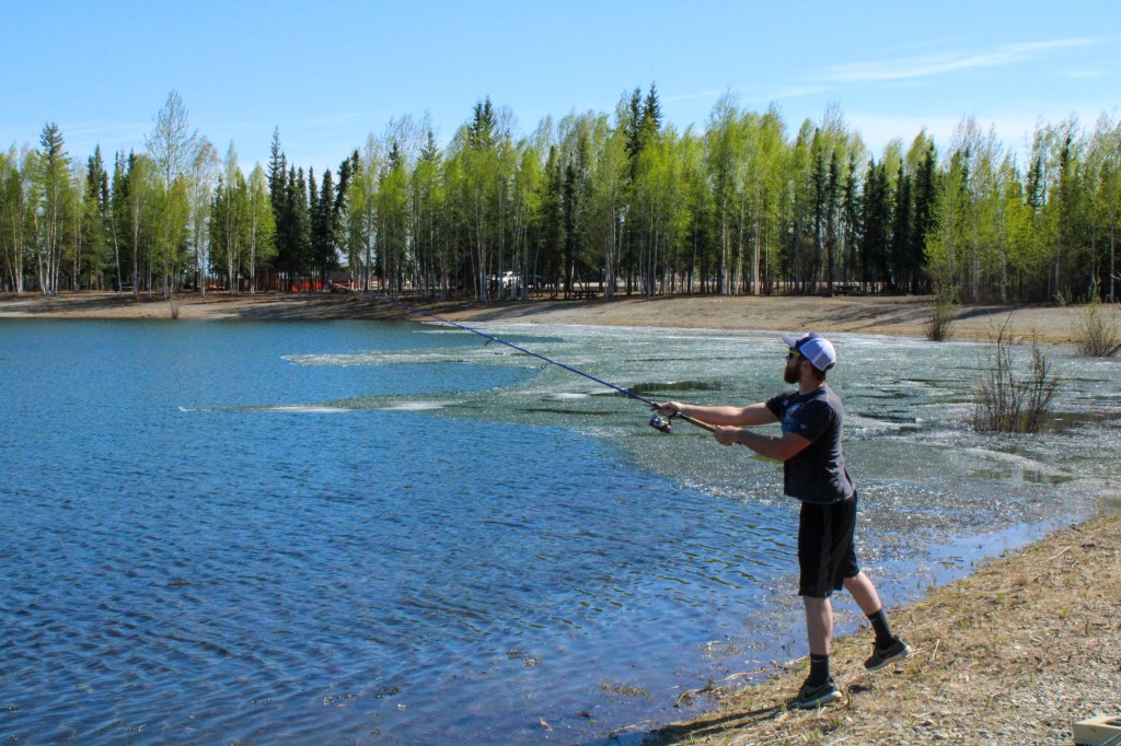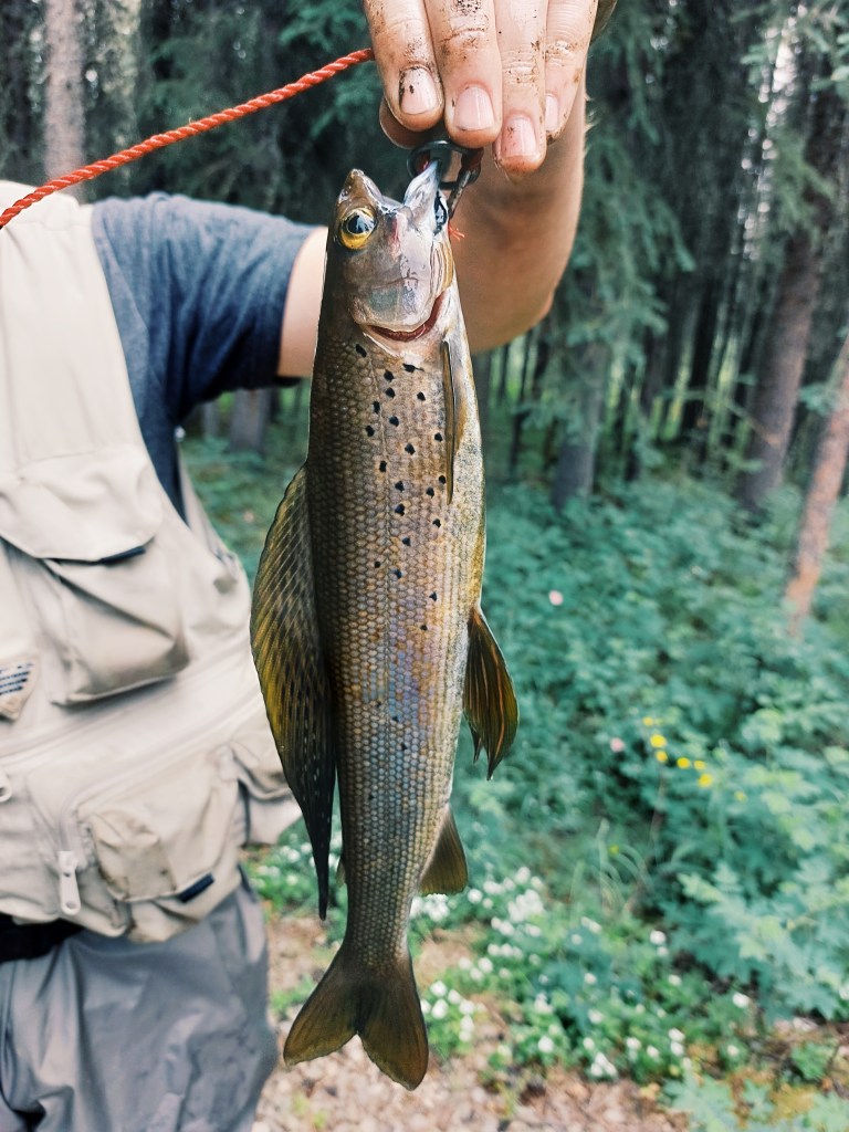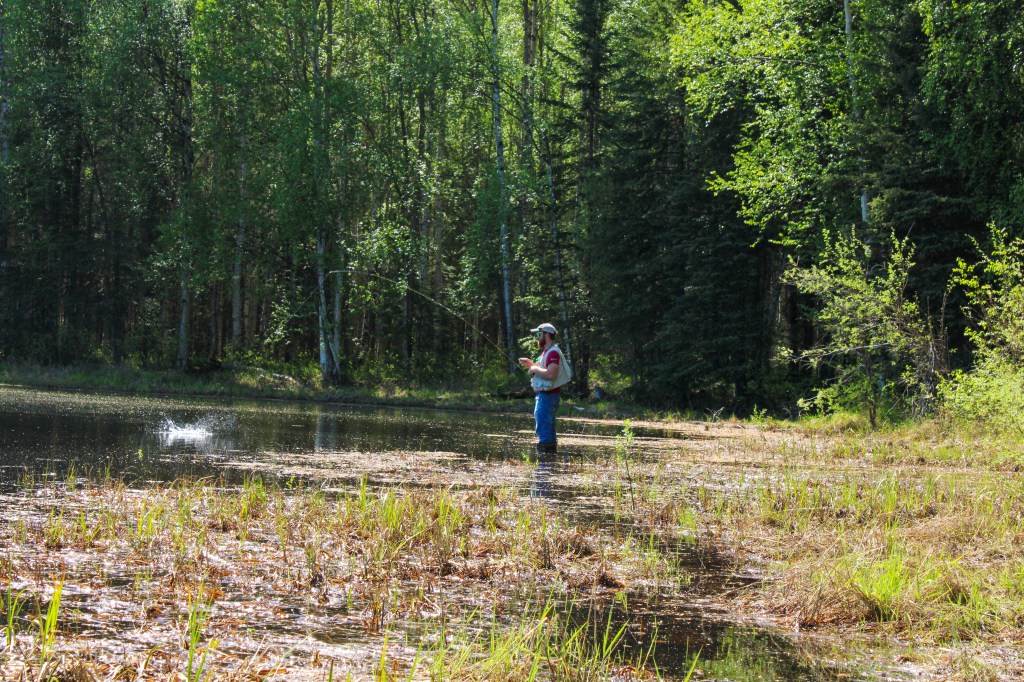 After our hike, we decided to try and fish along the different parts of the Chena River or ponds on the sides of Chena Road. Our first stop we didn’t even leave the truck because of the amount of people alongside the pond edge. We drove down the road some more before stopping again. This time there were very few people. So we got out, everything set up to fish and walked alongside the bank. Benjamin kept going into the water until if he went any further the water would go into his muck boots. His very first cast on the fly rod and he got a fish. The first fish any of us caught in Alaska. Was very exciting. He caught a small artic grayling. Later on he got another one and that was the end of the fish we managed to get.