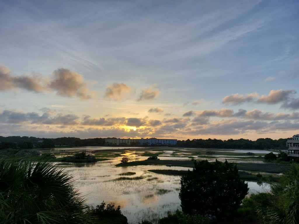 To help with the time change we set alarms in the morning so we didn’t over sleep. The family was very impressed we did this and didn’t sleep. But at the end of the week it was very helpful for us. Monday was a beach and pool day. Felt so nice to sit out in the sun by the water. What we didn’t expect is how warm the water was. The pool felt like a hot tub and the ocean felt like a bath. Not super refreshing from the heat and humidity. Oh did I miss the Alaska temperature right about then. Monday evening was spent in Harbour Town for dinner and checking out the shops. We picked up a pirate ship ornament. We like to collect small ornaments from different places we travel to. Watching the sunset over Harbour town with a few dolphins in the water.