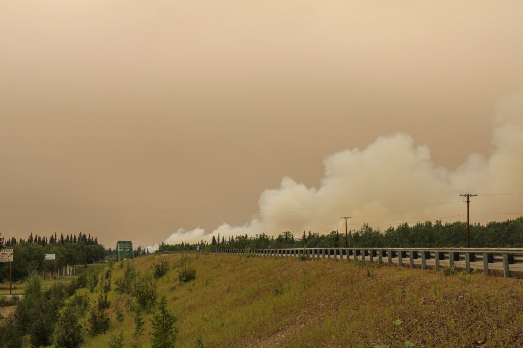 As we left the park to drive back to Fairbanks we passed one of the wildfires that we saw in the morning, it was the Clear fire right outside of Anderson. In the morning you couldn’t see the fire from the road but that quickly changed throughout the course of the day. Throughout the day it got windy and that changed the fire. The Clear fire was now right next to the road. As we approached Anderson all you saw was these big clouds of smoke and you could taste the smokeyness in the air. As we continued to drive you could see the fire right next to the road. After we passed the fire we pulled over to take some pictures and saw a helicopter getting ready to drop water on the fire. It was cool to see the fire but also concerning since it was so close. For about the rest of the weekend there was this thick smoke in the air from that fire and the other fires in the area. The fires prevented us from going to some places but we made the best of it.