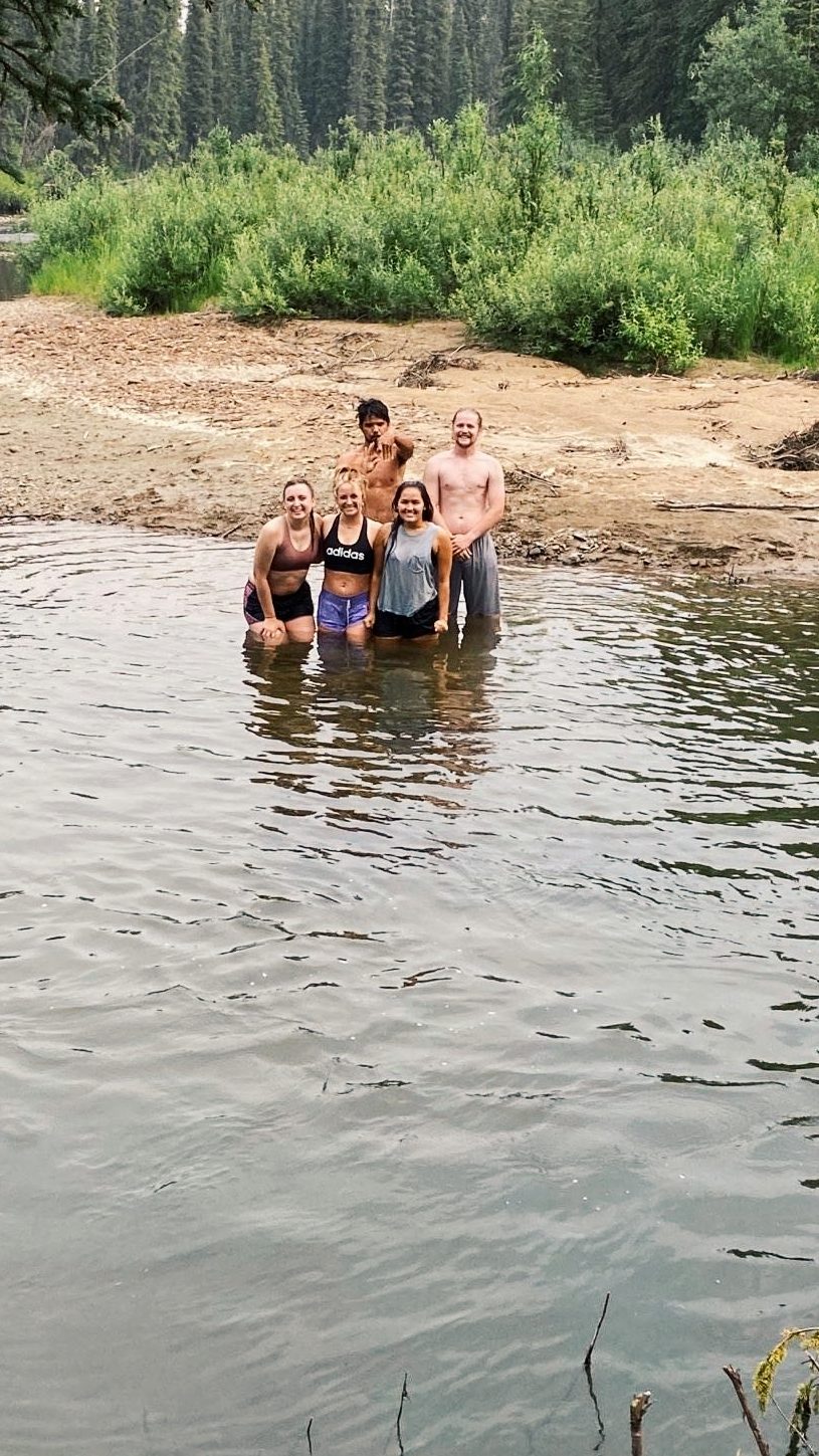 Sunday we all had breakfast together. Pancakes, sausage and bacon. Benjamin and I borrowed Chris’s four wheeler to go on a ride for part of the morning. On our ride Benjamin told me about this flower that is sometimes referred to as the time flower. Technically called fireweed. This flower blooms from the bottom up and is to be believed that when the top blooms winter will soon start. Most of our time was spent hanging out with everyone around the fire or fishing around the creek. At one point Lizzie, Nicole and I washed our hair in the creek. That was a process, with trying not to get completely in the water. So we would walk in a little, squat down and dip our hair in the water. I strugggled since I’m taller and didn’t want to get my butt wet when I squatted. As we are in the creek we can hear a thunderstorm starting to roll in. Shortly after we finished the storm came in. It started to pour, not like the rain on Saturday. Eventually it started to hail and people made mad dashes for their tents. Benjamin thought it shouldn’t last much longer so we stood on the table under the canopy. We were so wrong, the storm just kept coming. Eventually it was right on top of us. Lighting striking in front of your and thunder booming that bounced off the mountains. At a point it let up enough we could make it to the truck. While we waited it out Benjamin took a nap and I read a book. Once again our hammocks stayed dry.