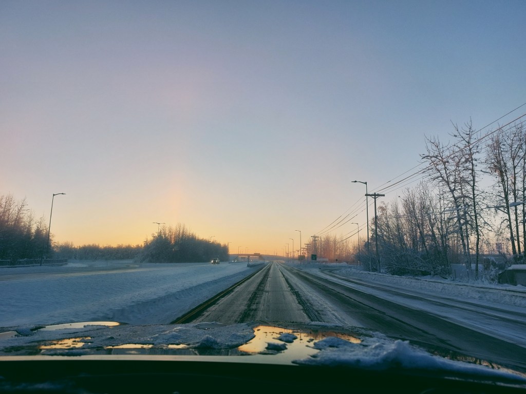 But the closer we got to leaving for PA the colder it got. The last several days have been around 40 below zero, so obviously it ins’t going to snow. Which I have enjoyed having Benjamin home in the evenings and getting scared at 3am when he crawls into bed. The 40 below is a different feeling but isn’t as bad as anticipated. Still not use to my nose hairs freezing as soon as you walk out the door or our front door being frozen shut with ice on the inside. The cold is a dry cold and not a wet cold that gets into your bones. But also don’t want to be out in it for long periods of time because it is very hard to breath. The shop dog when he goes out to use the bathroom ends up in a cockroach position before making it back inside because his paws get too cold. The truck is always plugged in now with the hope it will start up in the morning. So far it has started every morning even if it didn’t want too. With the weather being colder the sky at night is clearer except during the day. The last two days the ice fog has been bad. Basically the warm air has nowhere to go too so it hangs around at fog level making it hard to see in front of you. If the snow didn’t make peoples driving interesting the ice fog did for sure.