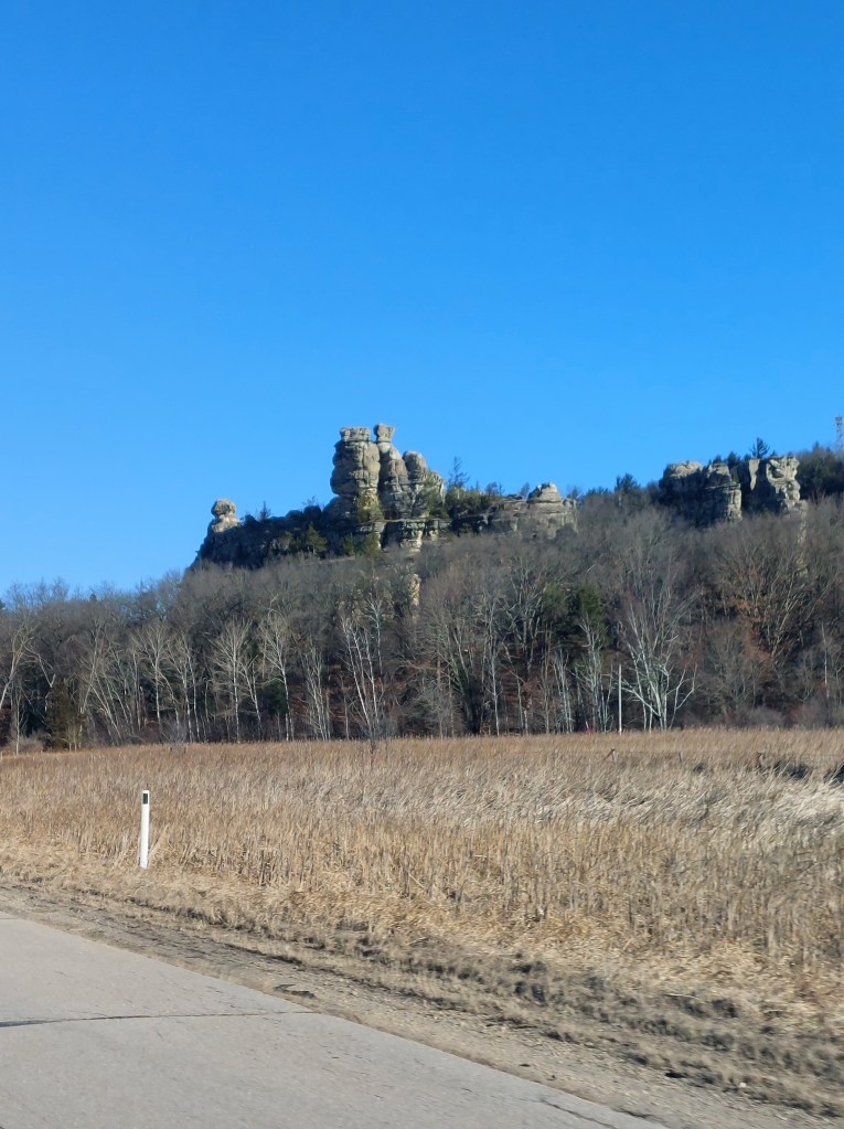 Cool Rocks in Wisconsin The very beginning of Wisconsin was cool. Lots of different rock formations and passed Camp Douglas. Fun fact: Wisconsin has cranberry farms. One town has a cranberry festival in September. We crossed the Saint Croix River which was still mostly frozen and entered Minnesota. Another state down!