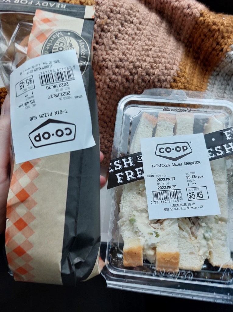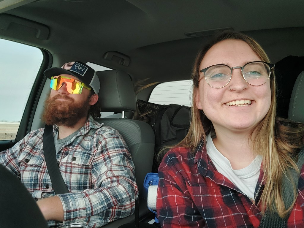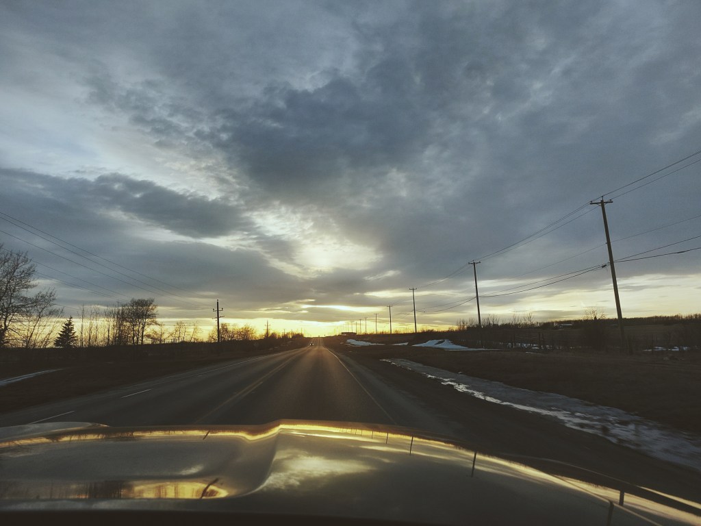 Happy to be in Canada! By 12:10 we hit another time zone which changed the time back to 11:10. We are now in mountain time, 2 hours behind PA. Then we started to see more snow. We kept driving and driving, Saskatchewan was flat just like every other state we traveled through. Right before we crossed into Alberta, we stopped for dinner in Lloydsville. We quickly realized that we hadn’t eaten yet all day. So we grabbed some gas station sandwiches and gassed up. At this point we had about 2 hours left of driving till we got to where we wanted to end at. So we kept trucking along.