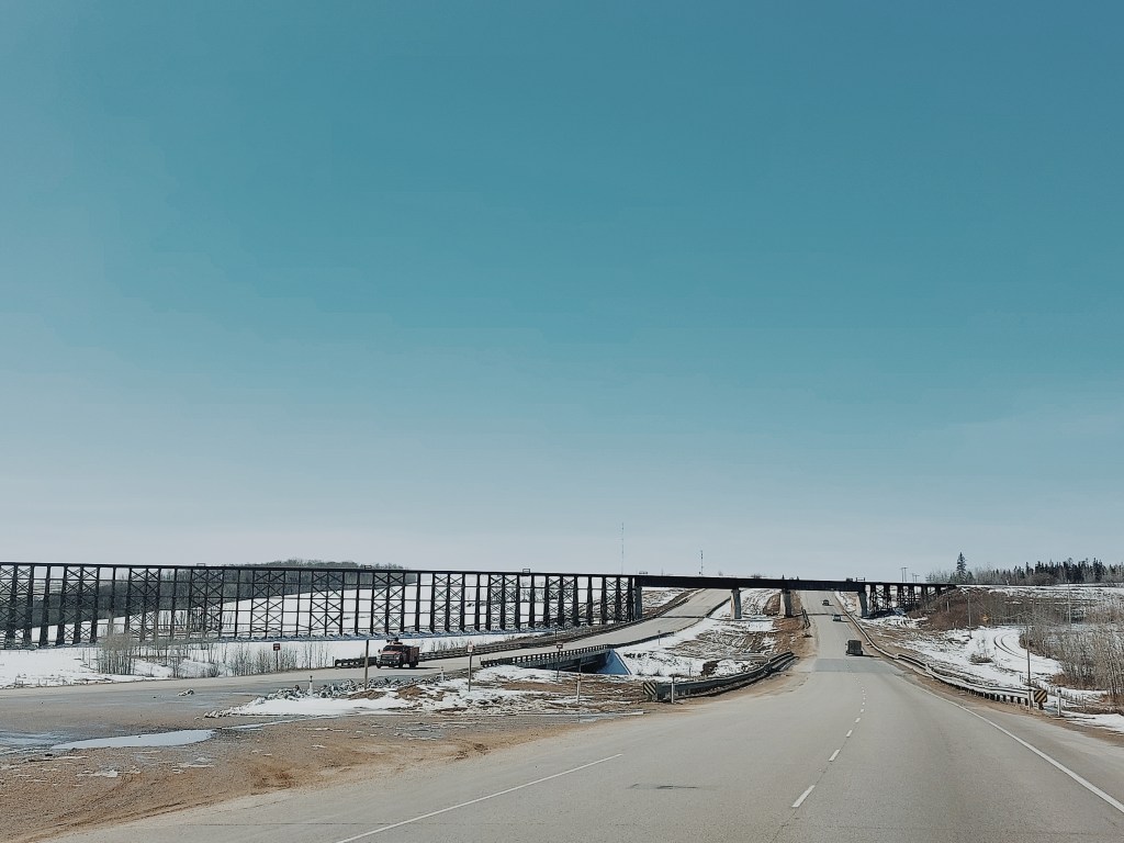 Railroad Bridge Now we kept driving and driving. Thankfully Northern Alberta isn’t as flat as very other state and provice we have driven through. And just like that we are out of the big hard wood trees. Just birches and pines. Going to miss those big trees. After some time we stop to fuel up at a very nice shell. Also picked up a nice hot dinner this time. No gas station sandwiches tonight. We upgraded to chicken tenders and potato wedges.