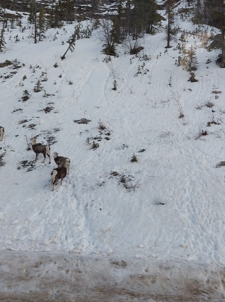 Big Horn Sheep 🐑 Driving through the Rockies was like nothing either of us has done. Driving next to them was amazing as well. You look up on either side of you and it is just mountain. As we drove along the Rockies, we saw a moose and someone ice fishing on Muncho lake. Just like that we were out of the Rockies.