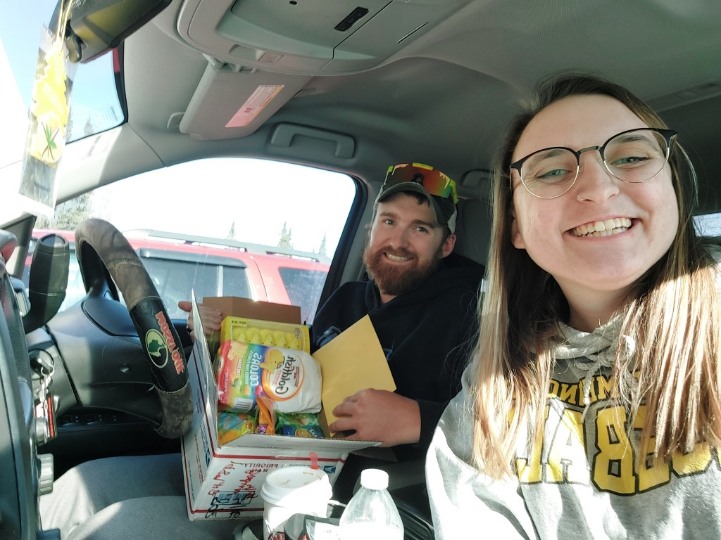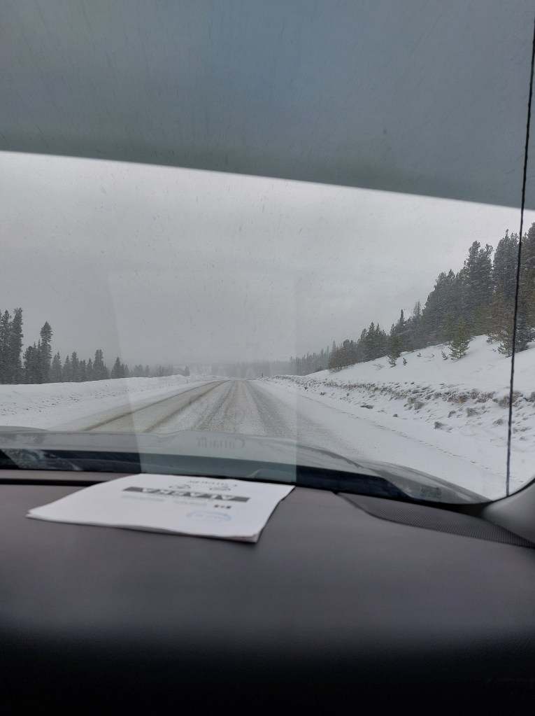 Dinner to go! After crossing into Alberta it started to flurry. The flurries were small, but didn’t last the entire drive. Kept coming and going. We finally ended our day in Edmonton Alberta. Once in the hotel, we tried to schedule our virtual covid test that is required by the government. We tried and tried but couldn’t get it to work so we decided to wait till the morning. In total today we drove 715 miles and made it into Canada!