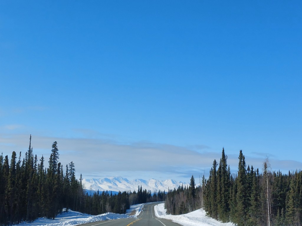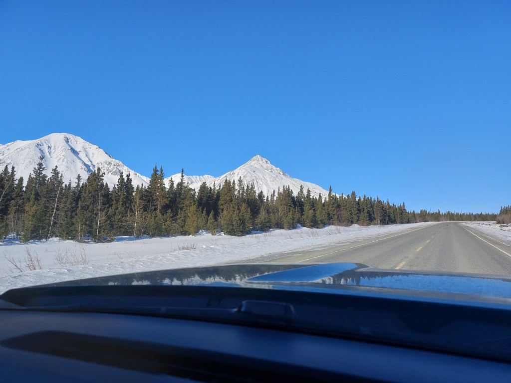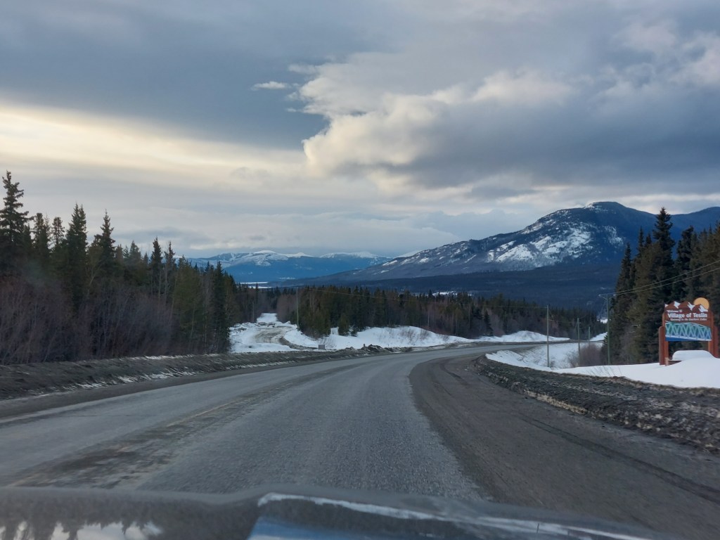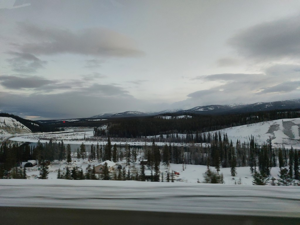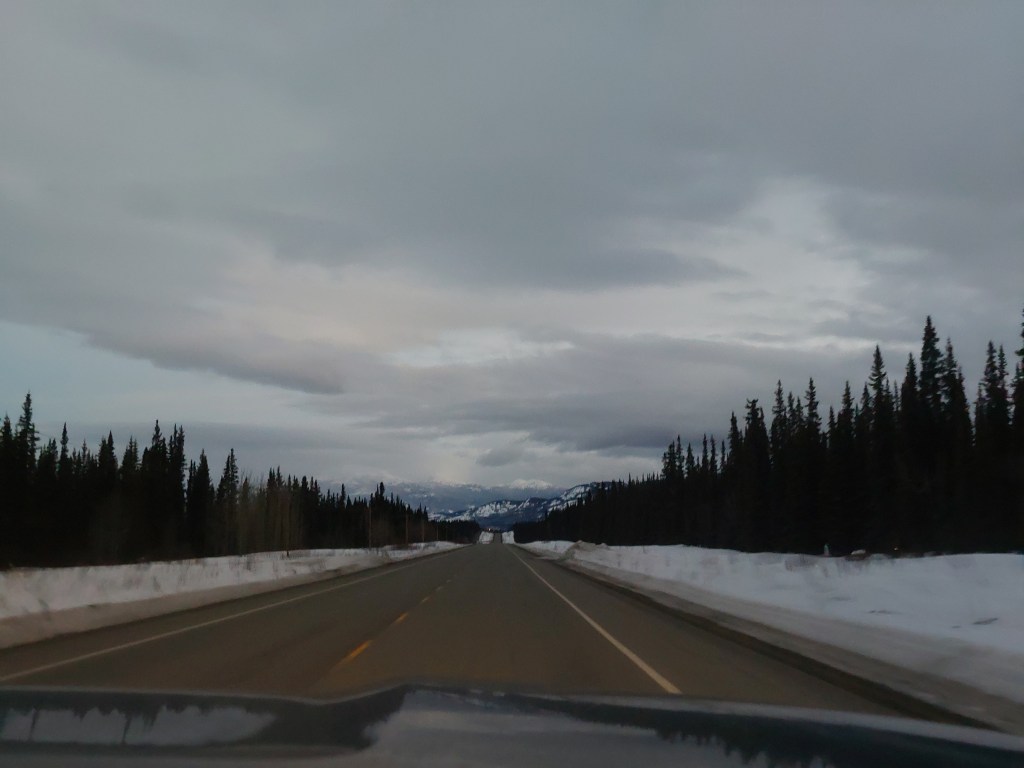 Tim Hortons As we keep driving through Northern British Columbia the scenery really starts to change. A lot more snow on the ground than before and different animal signs along the road. One cool this is that they push the snow really far off the road so there is no change you can get stuck on the side. There is also a lot less cars on the road. Mainly tractor trailers and you only seem them sporadically.
