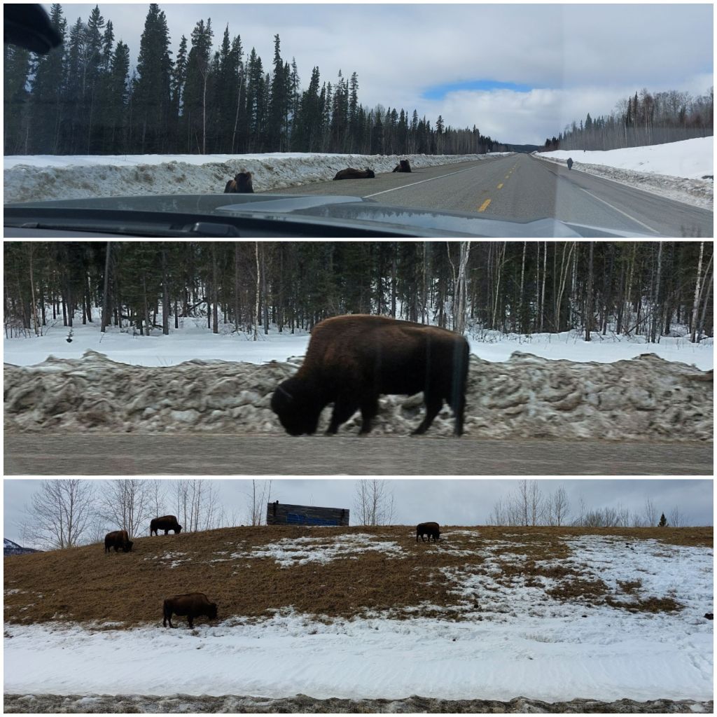After some time, there was a sign that said “Drive with caution. Bison next 90km”. All coming back to that Bison on highway sign. Well things did get interesting. I have never seen a wild Bison. As soon as I said something to Benjamin he said look across the bridge there is some. That was a herd of 5. Then there was a herd of 4 right on the side of the road. As we kept driving we saw even more. And not just little herds, massive herds spanning both sides of the road. The last herd we saw there was one standing on one side of the road acting like it wanted to cross. As it started to move as we got closer, it changed its mind and walked along the road right next to the truck. The Bison were cool to watch. Some were nose deep in the snow trying to get the grass underneath. Seemed like they were using their nose as shovels.