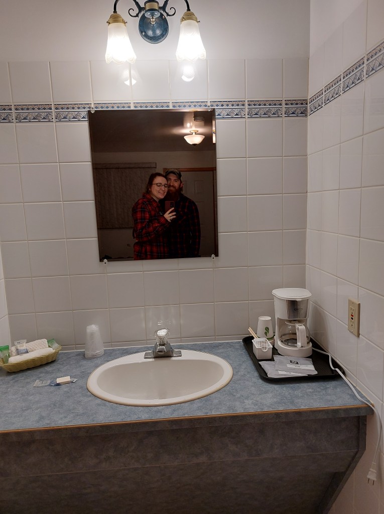 Remember that tire mishap from yesterday, well we tried to get it fixed first thing this morning but that didn’t work out. Was told the garages didn’t open until 7. So we waited and waited. 7:45 rolls around and the shop gave us a call. He was running late due to a fire alarm that morning and would be to our location in 45 minutes. So to kill time, we decided to make coffee. We first tried to use the electric tea kettle in the truck outlet. Quickly learned the truck can’t handle the amps needed for the kettle. So, I stood outside next to the outlet to plug your vehicle in over the winter. And we made instant coffee. Only problem was I burnt my mouth and tongue so bad. So I said no to having anymore coffee.