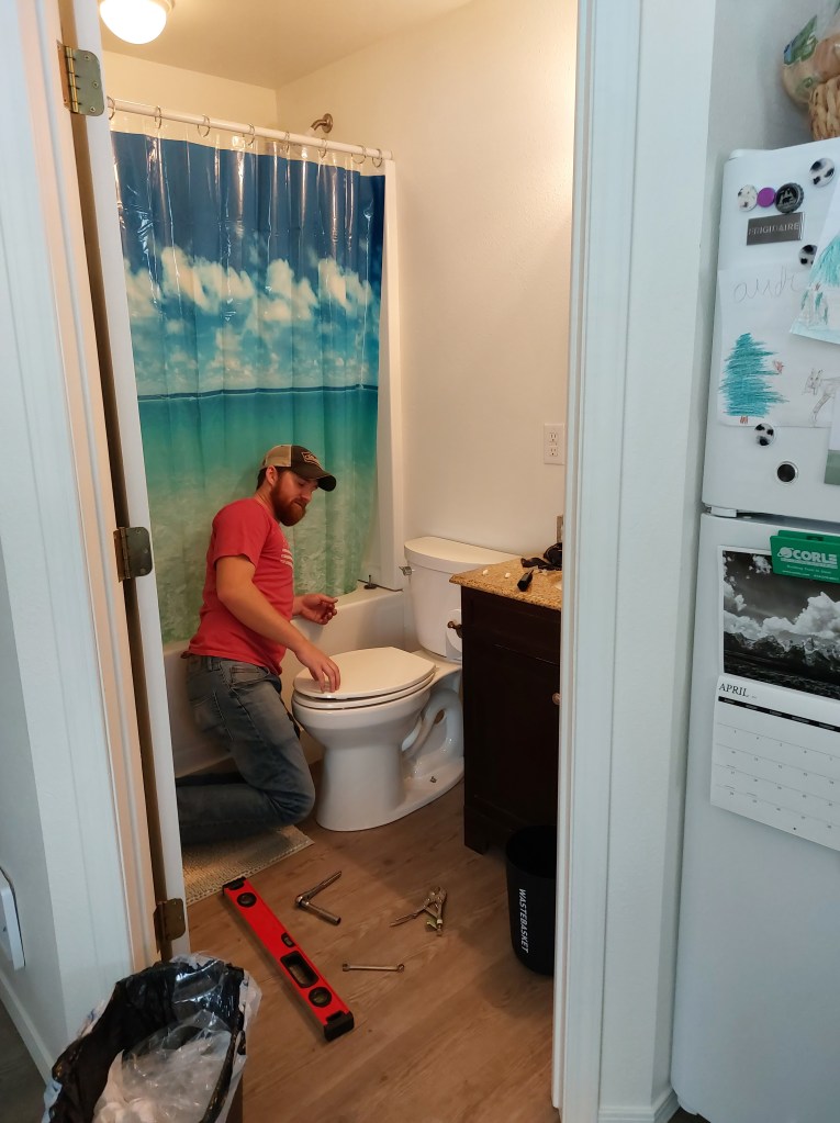 After errands we, well Benjamin, replaced our toilet. This week I noticed that right at the bottom our toilet was leaking and there was a hairline crack. Benjamin let the Landlord/his boss know. He got us a new toilet and Benjamin installed it on his own. I was very impressed with him. Now have a new toilet with no leaks.