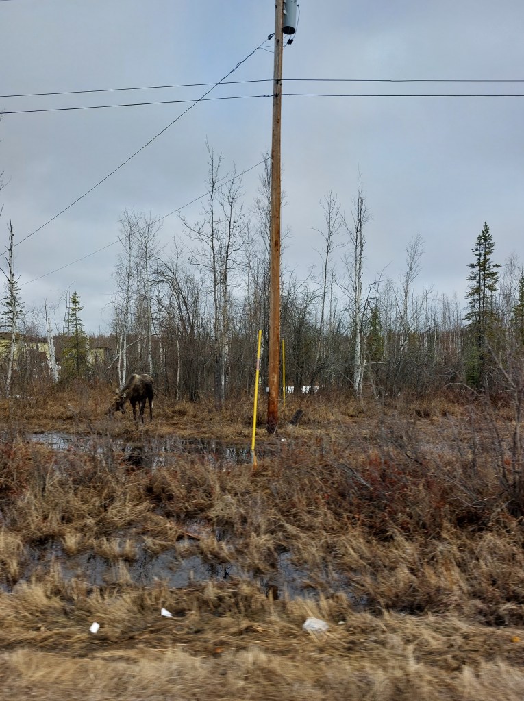 Moose As everything warms up, the animals are coming out a lot more. It is fairly normal that see moose right along side the road. It is still really strange to see the moose on the roadside. They are so big. Slightly terrifying to be driving down the road and see them right there. Very difficult to not want to freak out while driving.