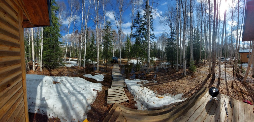 Getting the front plate set The snow has really started to melt now. But instead of just seeping into the ground it puddles. There is still a layer of frost that doesn’t let for the melt to seep. So now we have a river through our driveway. And it isn’t just at our place it is everywhere. Water puddles everywhere. So much water. But now we can see most of the cabin and the area around it.
